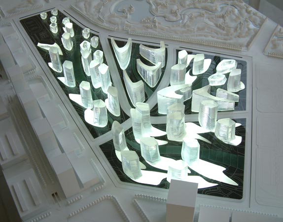 當時,我面臨兩個選擇:一個是參加世貿中心重建方案的競賽,另一個是設計中國CCTV。我覺得CCTV項目從概念上來說,其實是一個翻譯的過程——將高層建築現象翻譯成可以適合中國媒體使用的形式;把我之前的設計尺度翻譯成可以適應CCTV的尺度。CCTV為我提供了一個非常獨特的翻譯的可能性。我第一輪CCTV的方案基本上是按照西方的創造形象的方式翻譯了一個物件——一個大體量的建築。顯然這個翻譯是有問題的,因為沒有研究建築的很多問題,只是用一個雕塑甚至是浮雕的藝術狀態來表達建築。這個方案受到了很多批評,因為它沒有把建築的更多深度表達出來,沒有把建築狀態表現出來。在這個方案模型接受評標的幾個小時後,我們在北京找了一家模型公司。在那,我們將我們對中國所有在語言和操作層面上能感知到和理解到的內容融入了新的創造。於是,一個完全中國式的模型產生了。為了讓很多中國領導看見這個模型,我們開了一輛卡車裝著這個模型在北京晃了好幾天。